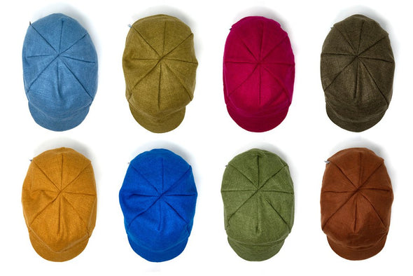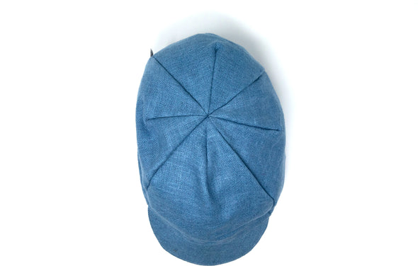 Muriel is wearing the 4-panel cotton cap in blue-grey with a cyan ribbon
