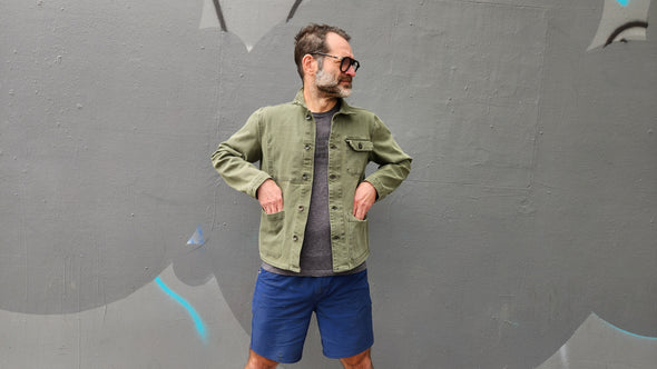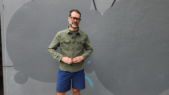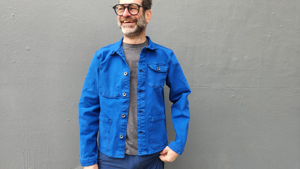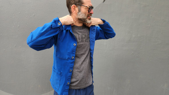 matt standing in front of a grey wall with overdye black skinny jeans and blue wander overshirt